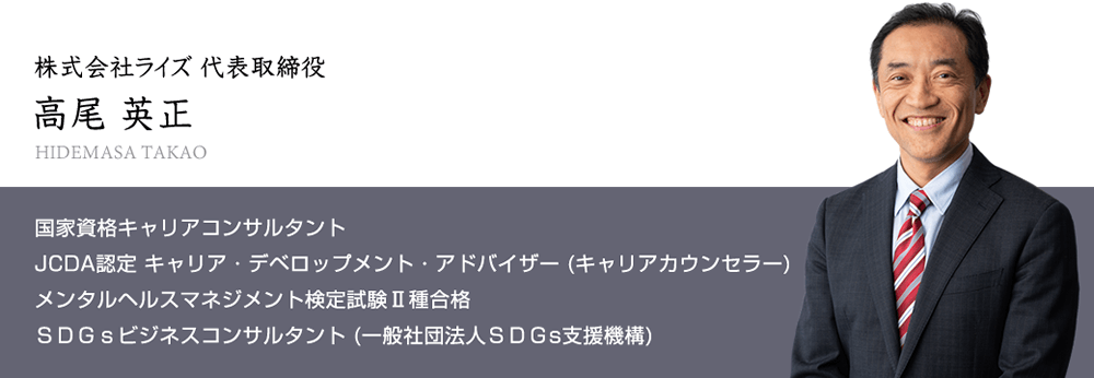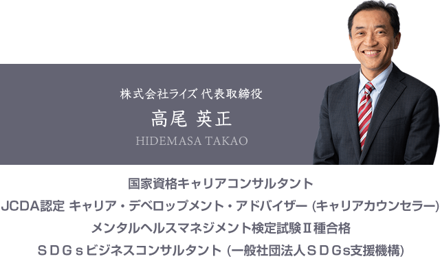 2009年、ライズを創設し、1年後に法人化。教育研修事業を中心に就職支援事業、広告事業の3事業部を展開。「実践につながる内容とアウトプットするプログラム」により「現場で活かせる」研修を企画運営。国家資格キャリアコンサルタント、SDGsビジネスコンサルタント、メンタルヘルスマネジメント2種取得。